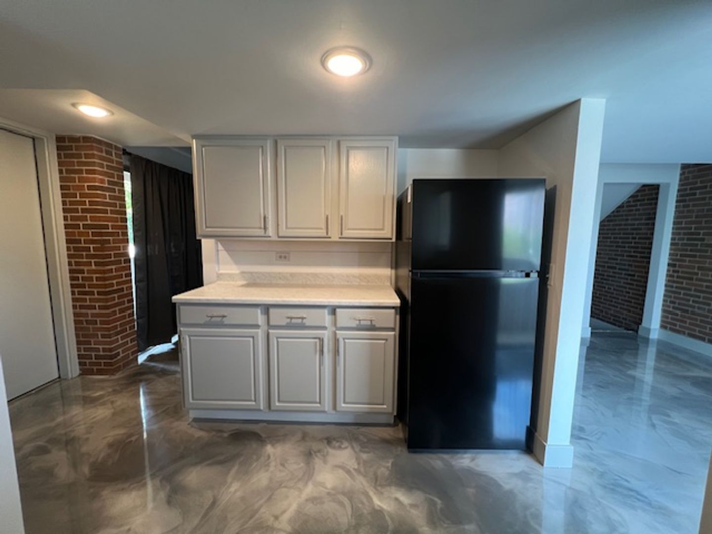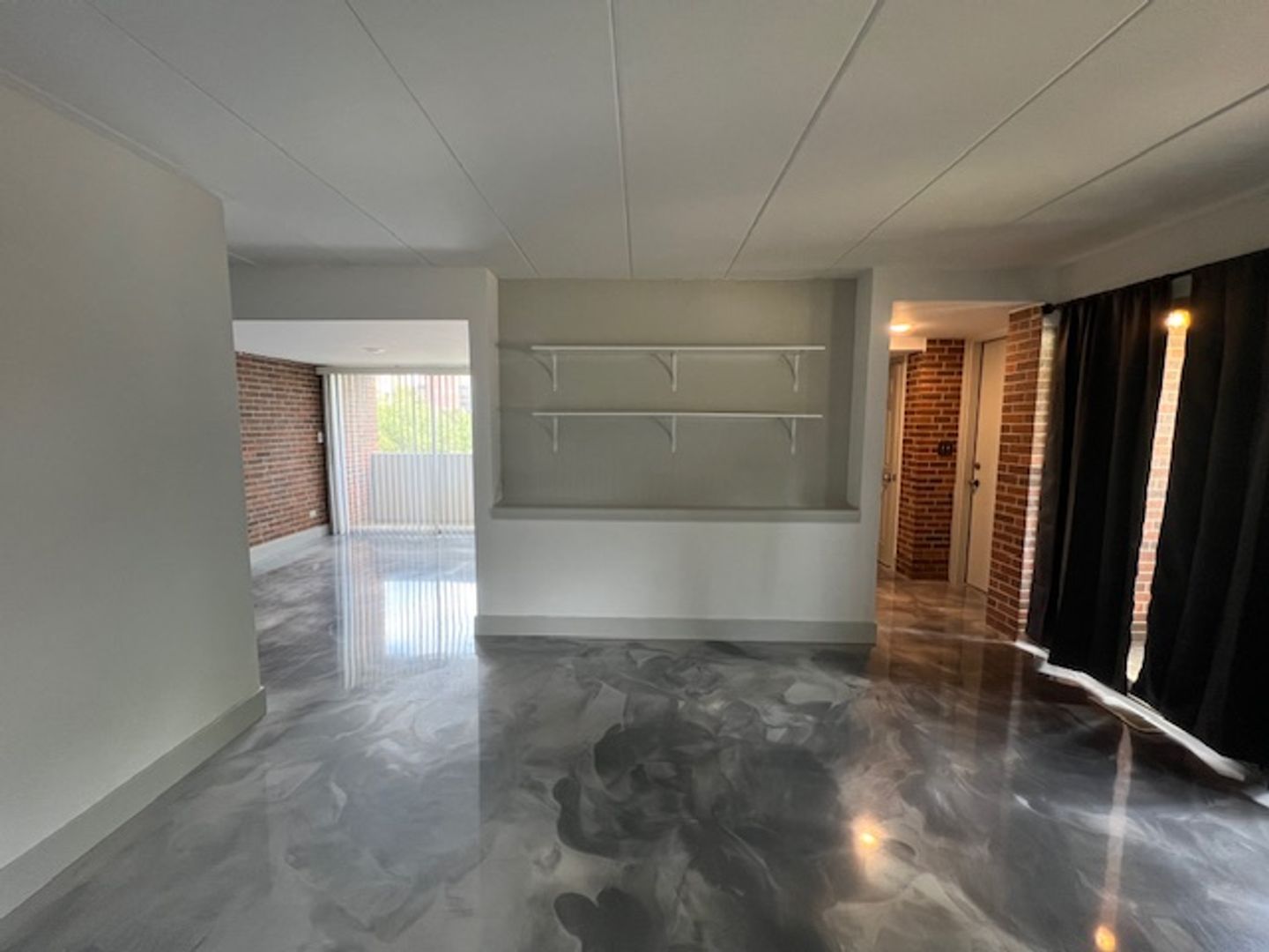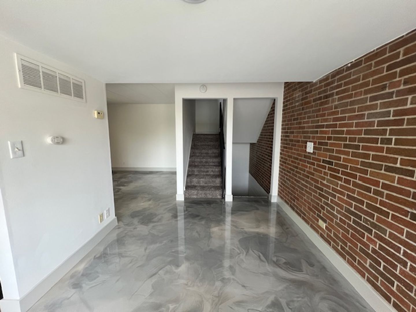 All bedrooms will have new carpet. The rest of the apartment will have hard surface epoxy floors. They will be a gray marbled look.