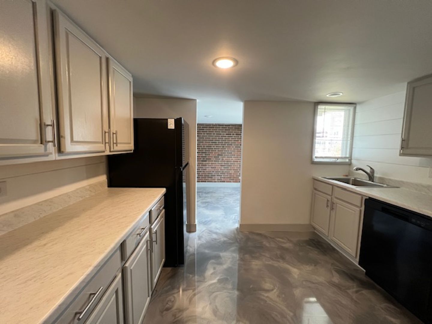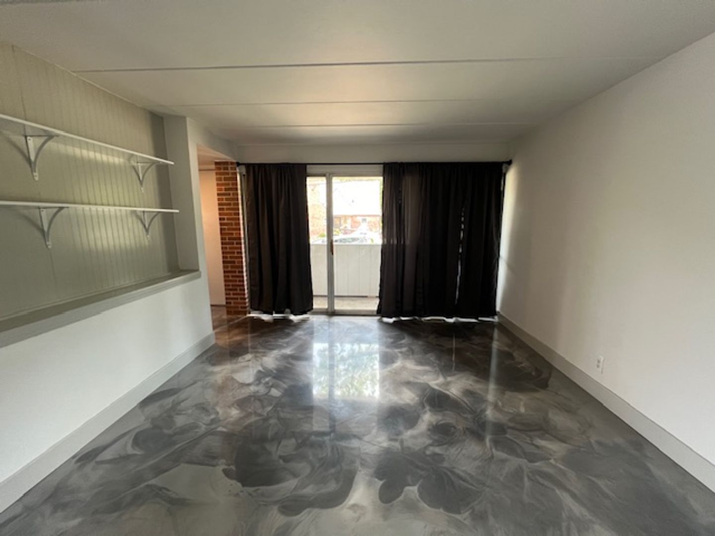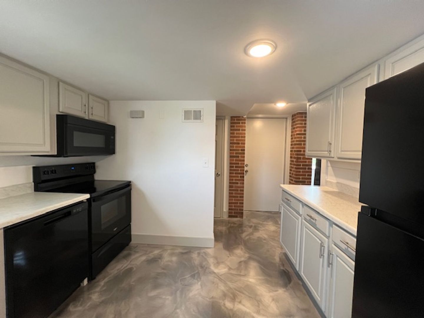 All bedrooms will have new carpet. The rest of the apartment will have hard surface epoxy floors. They will be a gray marbled look.